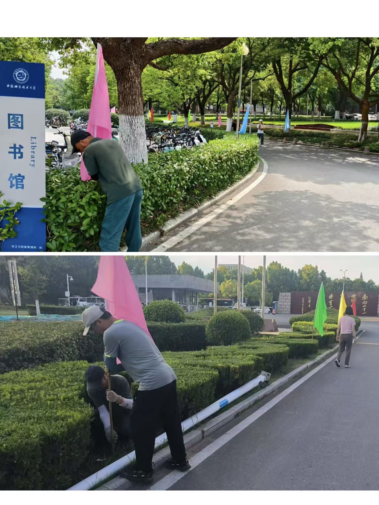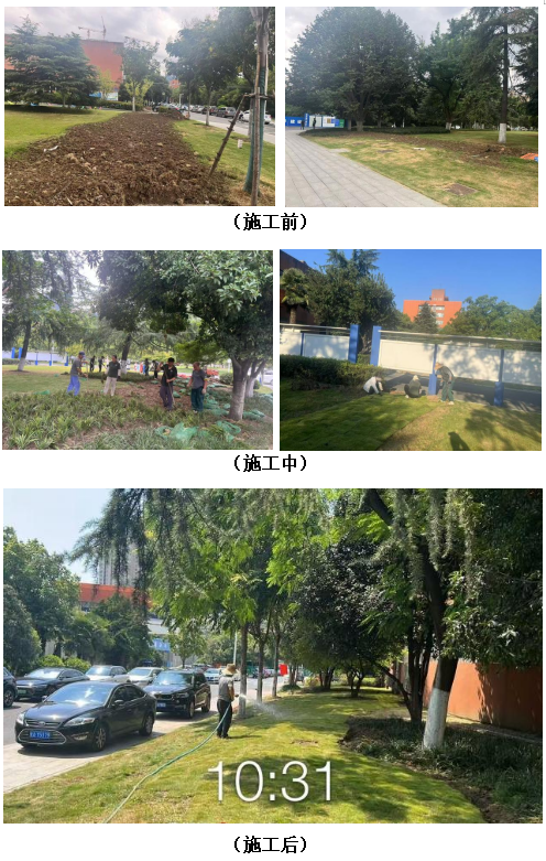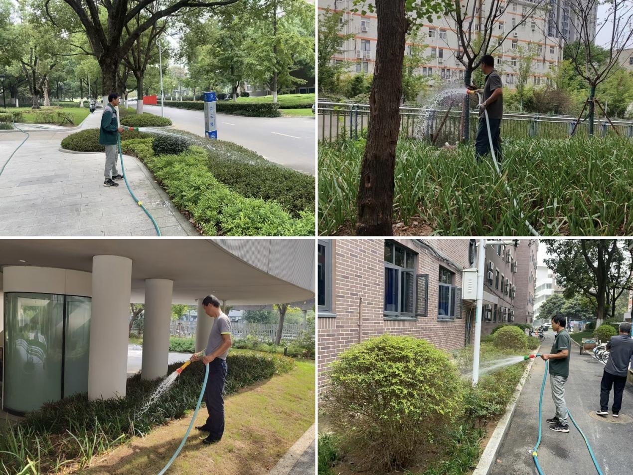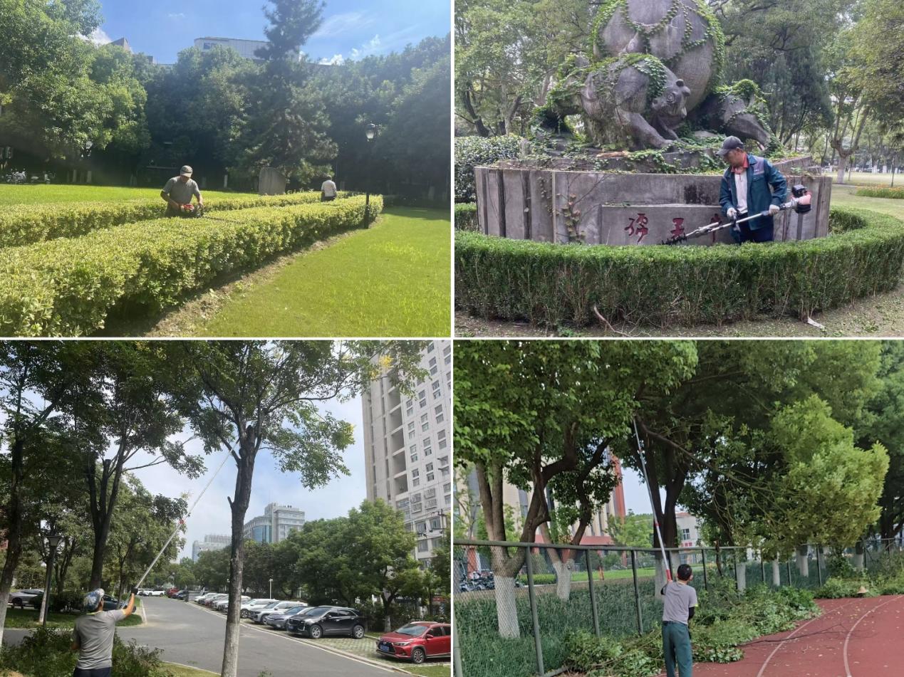 九月校园绿化养护工作持续稳步推进,主要包括抗旱浇水、草坪与绿篱修剪、地被绿篱除杂、行道树萌芽枝清理及病虫害防治等,维护校园绿植健康生长。具体工作内容如下: