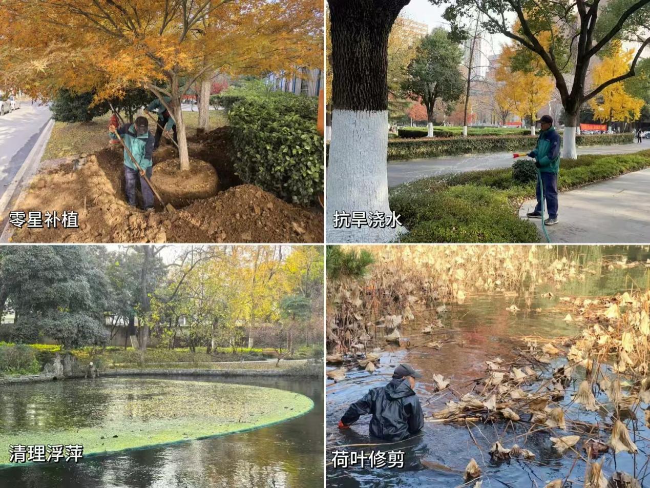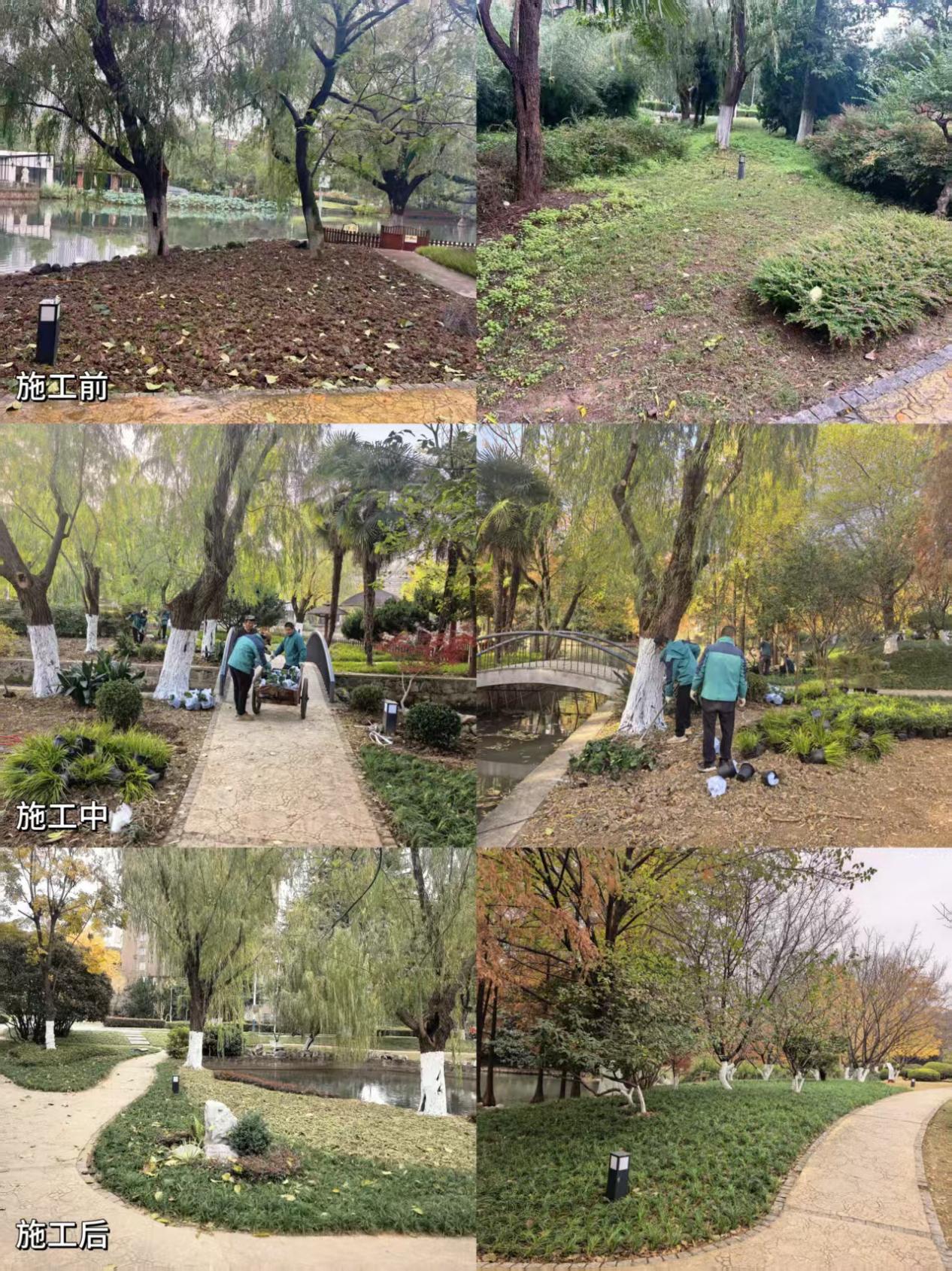 仲冬渐近,气温持续回落,植物渐入休眠预备期。本月养护工作重点围绕大乔木、草坪及绿篱精细化修剪,乔灌木涂白防寒,花灌木开盘松土与养分补充等核心任务开展,为植物安全越冬筑牢基础。具体工作内容如下: