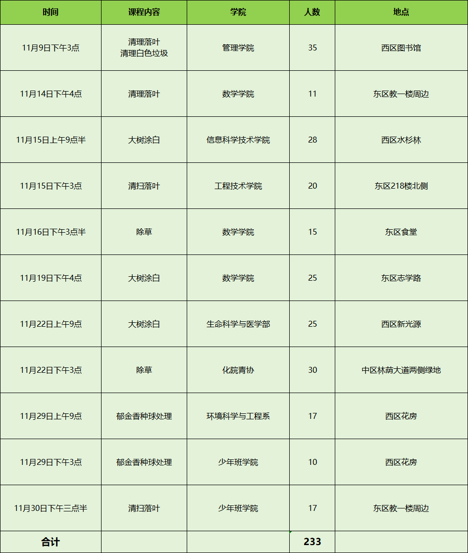 11月新增大树涂白和郁金香种球处理特色劳育活动。丰富多样的劳育活动,助力校园冬季绿植养护的同时,进一步激发学生参与劳动、共建美好校园的热情。本月已完成劳育活动如下: