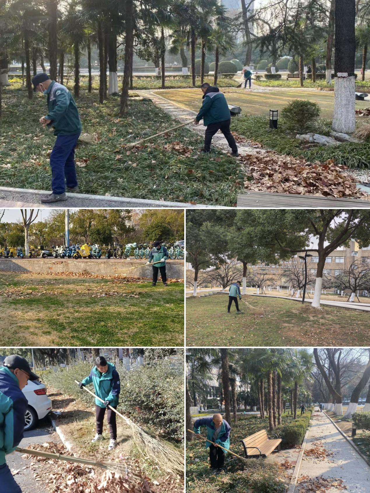 本月校园柳树、法梧等少量树木尚有零星落叶,香樟开始出现少量落果。环卫工作集中在清理道路残余落叶及卫生死角,保持路面整洁;同时因冬季气候干燥、扬尘较多,加强果皮箱的日常擦拭。主要工作内容汇总如下: