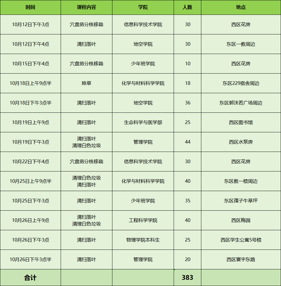 十月学生劳育课程活动报名热度明显增加,中心根据报名需求增加活动频次,学生参与活动热情高涨,亲手装扮和维护美好校园环境。十月已完成的学生劳育活动如下: